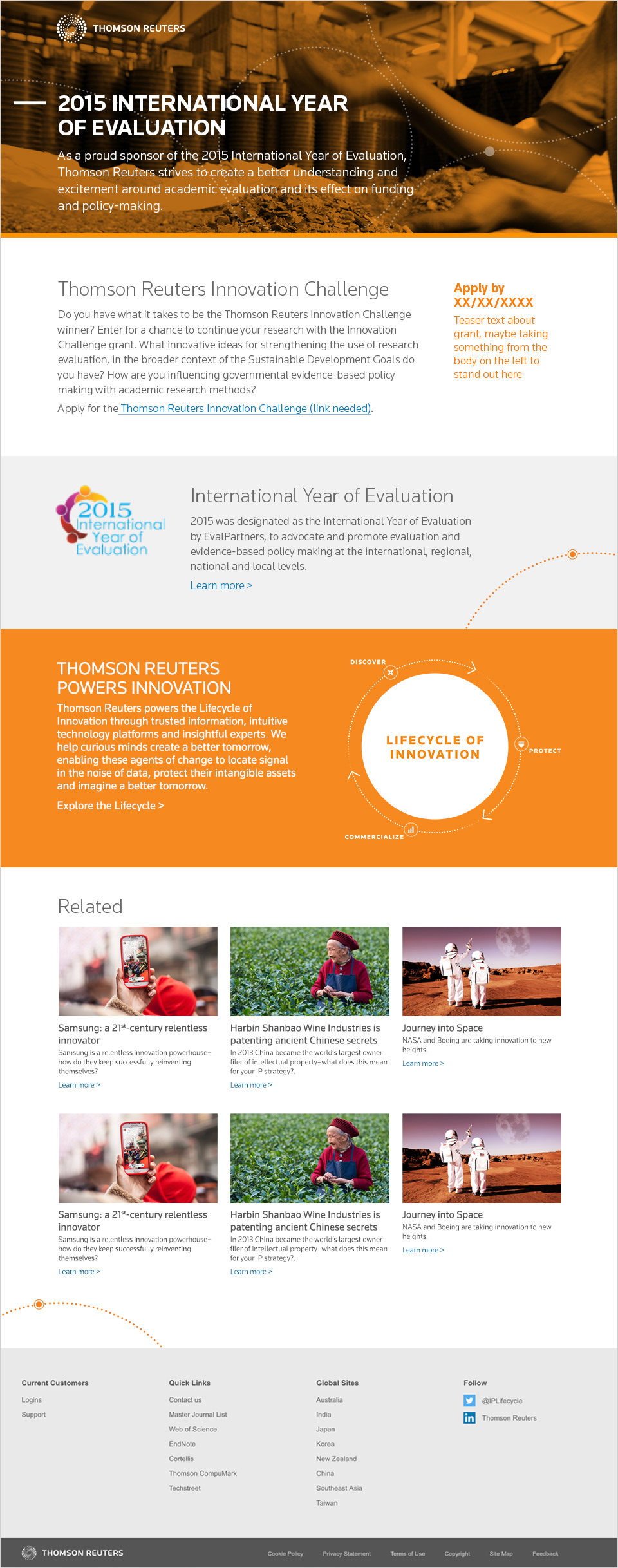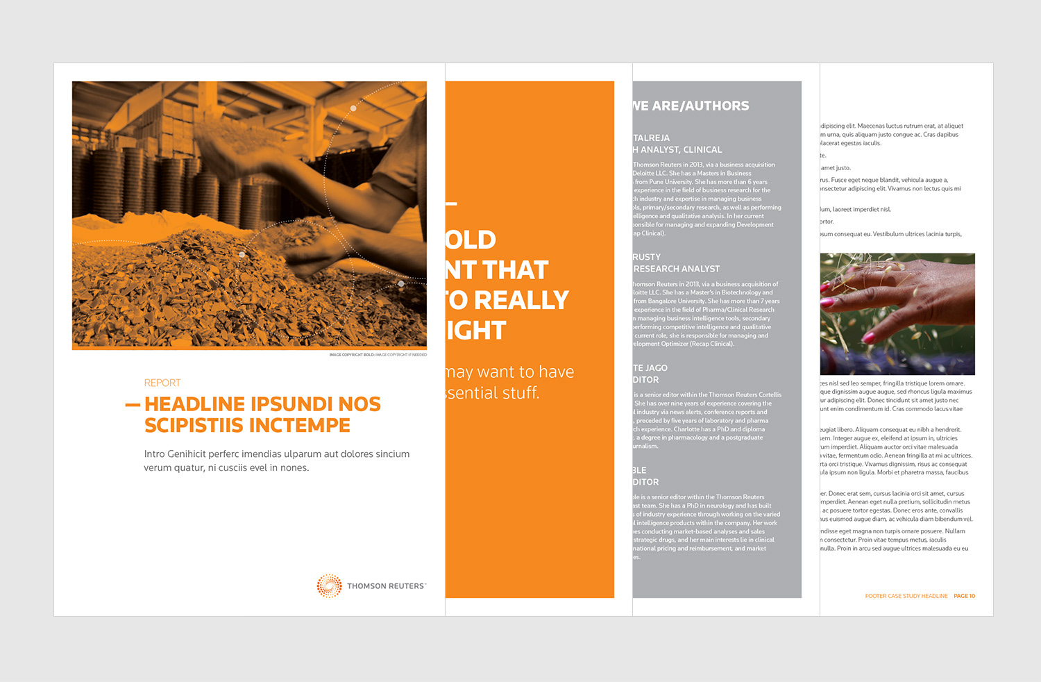 Art direction and Design: Sónia Teixeira September 2015 The IP & Science business re-branded itself in September 2015, standing apart from the master Thomson Reuters brand, still feeling like part of the same family, and so new templates were needed. The design leverages the dotted circles used on stateofinnovation.com, the thought leadership website for the business, and striking duotone images. IP & Science’s innovative flare shows through using a rule before every headline, flat colour illustrations, typographical contrast, and plenty of white space.